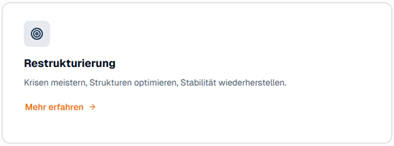 "Die Restrukturierungsberatung hat meinem Unternehmen in der schwierigen Phase wieder Stabilität gegeben. Kompetente Analyse, klare Handlungsempfehlungen und umsichtiges Management – ich bin sehr dankbar."